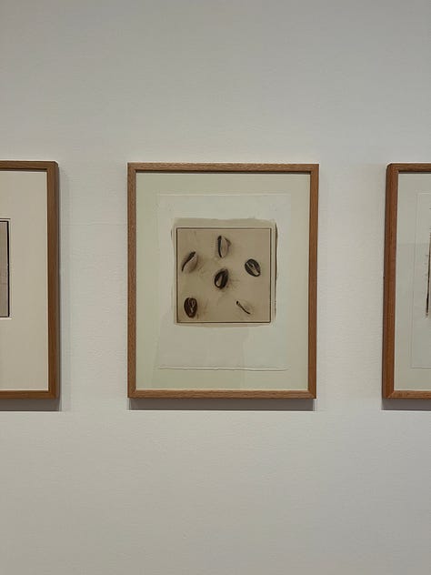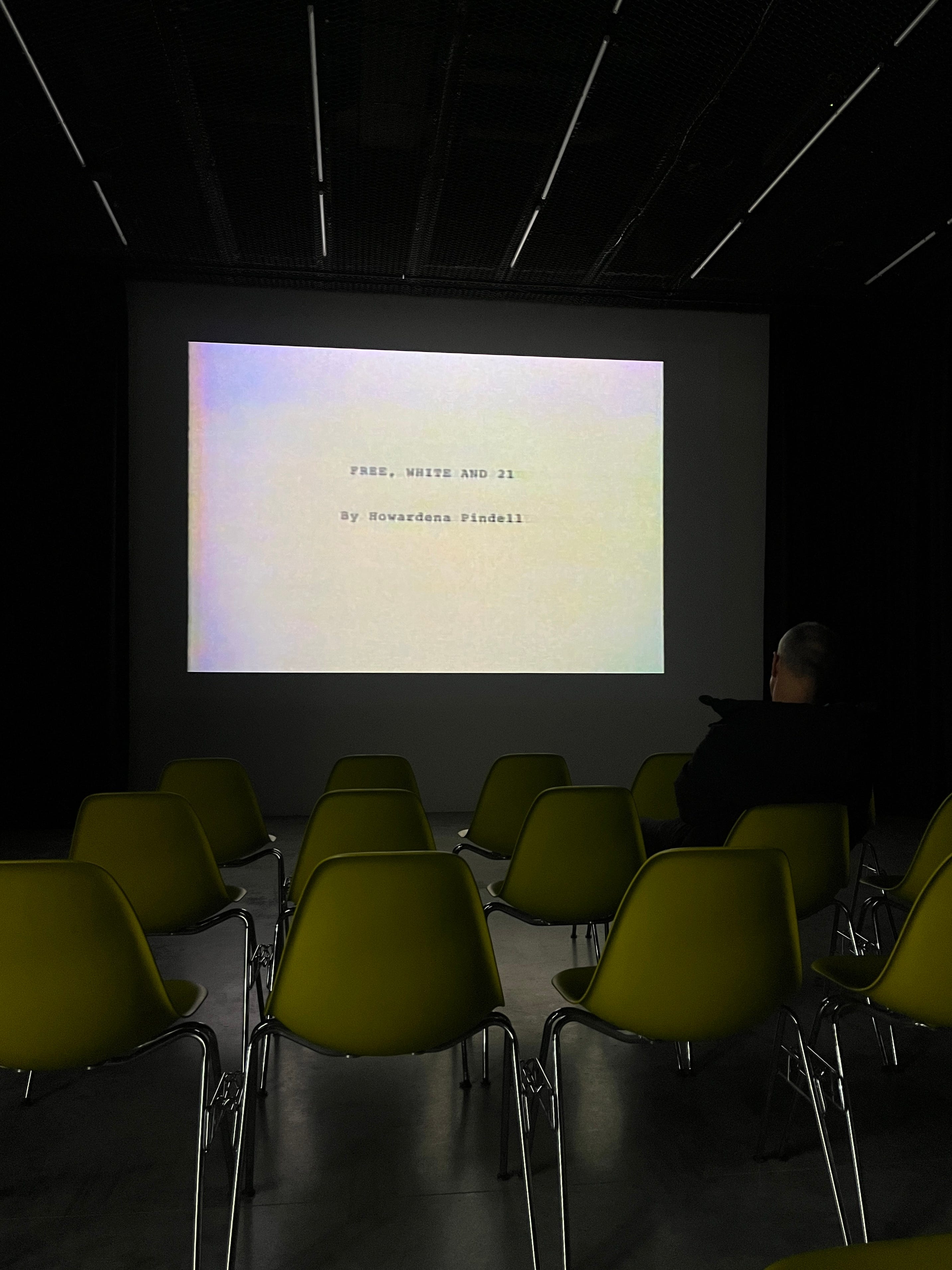 That feeling, loosely, didn’t end there. I made my way to White Cube gallery the next day to see African American painter, mixed-media, and abstract artist Howardena Pindell’s solo exhibition Off the Grid. Including her large-scale paintings, sculpture, and collage works from her career of over 60 years (extremely beautiful and innovative for their material depth, might I add), Pindell also showed three video works: Free, White and 21 (1980), Doubling (1995), and Rope/Fire/Water (2020). The curtained room showing the videos lay in the back of the gallery space with rows of neon green chairs waiting to be filled.