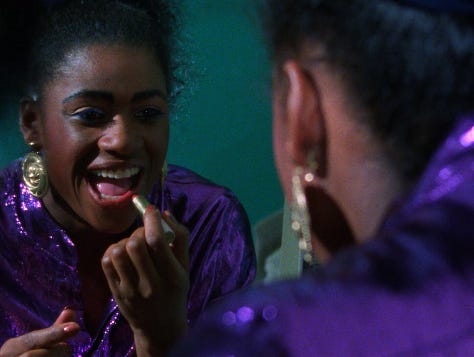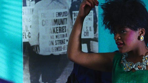 I was appreciating the various displays of style and poise on the wall projection when a bright, flashing light centered on the wall like a sniper’s target. An older woman in the front row began recording the film and snapping pictures on an even older digital camera. A friend of mine and I exchanged looks as the red flash kept appearing in short increments, sometimes directly on Baldwin’s face and chest. A target he seemed, indeed. The rest of the crowd began to react silently, turning toward the woman to alert her, nonverbally, of her disturbance, but it appeared that she was none the wiser. Maybe she wanted to document the film for her personal archive, send it to a friend, or just watch it later in the comfort of her home beyond the big screen. Whatever the case may be, I couldn’t shake a few things: the camera, in this instance, was a sort of weapon interrupting the show of Blackness before us; the camera was in the hands of a non-Black audience member in a more populated non-Black audience of people attending the screening; and every time that red flash did its duty, the fabulated audience of Black characters in the documentary seemed to make eye contact with us—breaking the fourth wall with their watching, interrogating, warning.