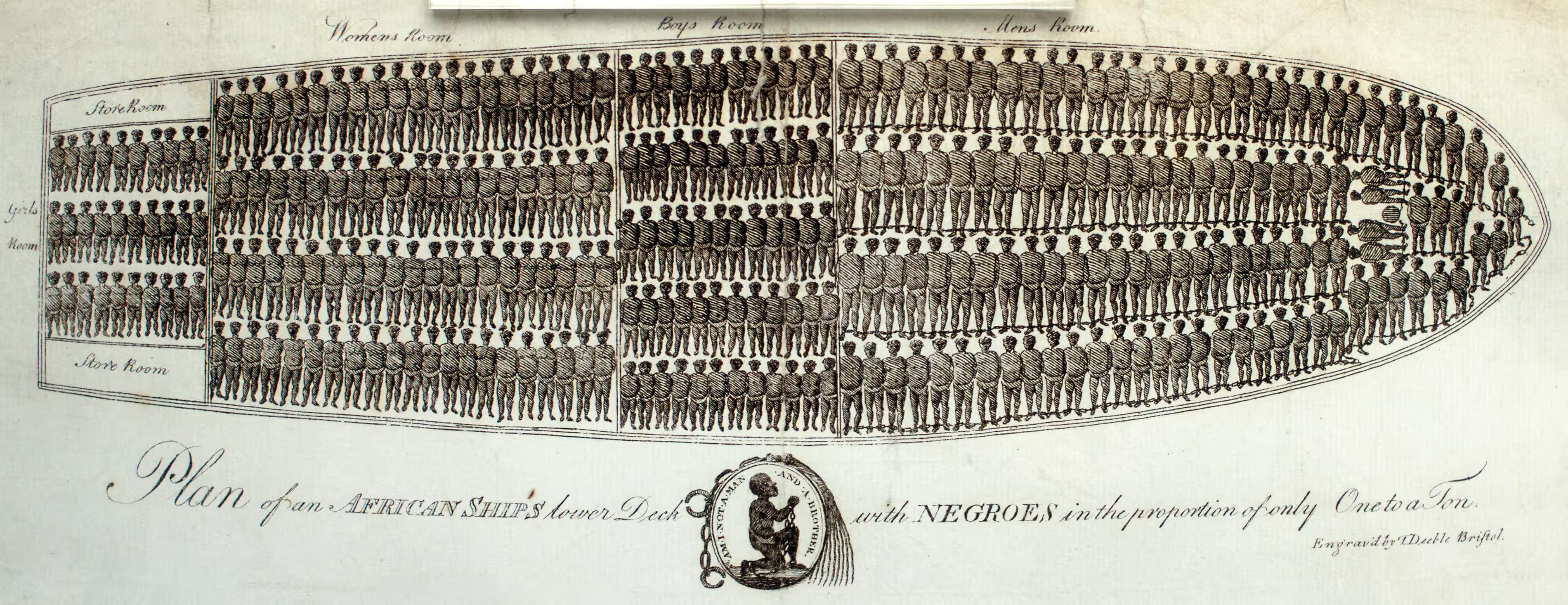 Some weeks ago, I burned myself with an iron. At the sound of burning flesh — a short sizzle — I jumped, took a breath, and took a look at the scar forming on my abdomen. I was disappointed in myself, briefly, for my clumsiness, but my second thought was to call my mother. She had a similar run-in with an iron, the whole face of the flat side burning her on the outside of her calf. Imagine its mark. Now, we share the same one. Looking at my new scar daily, I was reminded that the image of iron’s face and its related materials (e.g., the ironing board) are eerily similar in shape to the cut-away diagrams of slave ship interiors. The holes releasing the iron’s heat mimic cramped Black bodies stacked in transport across the Atlantic.