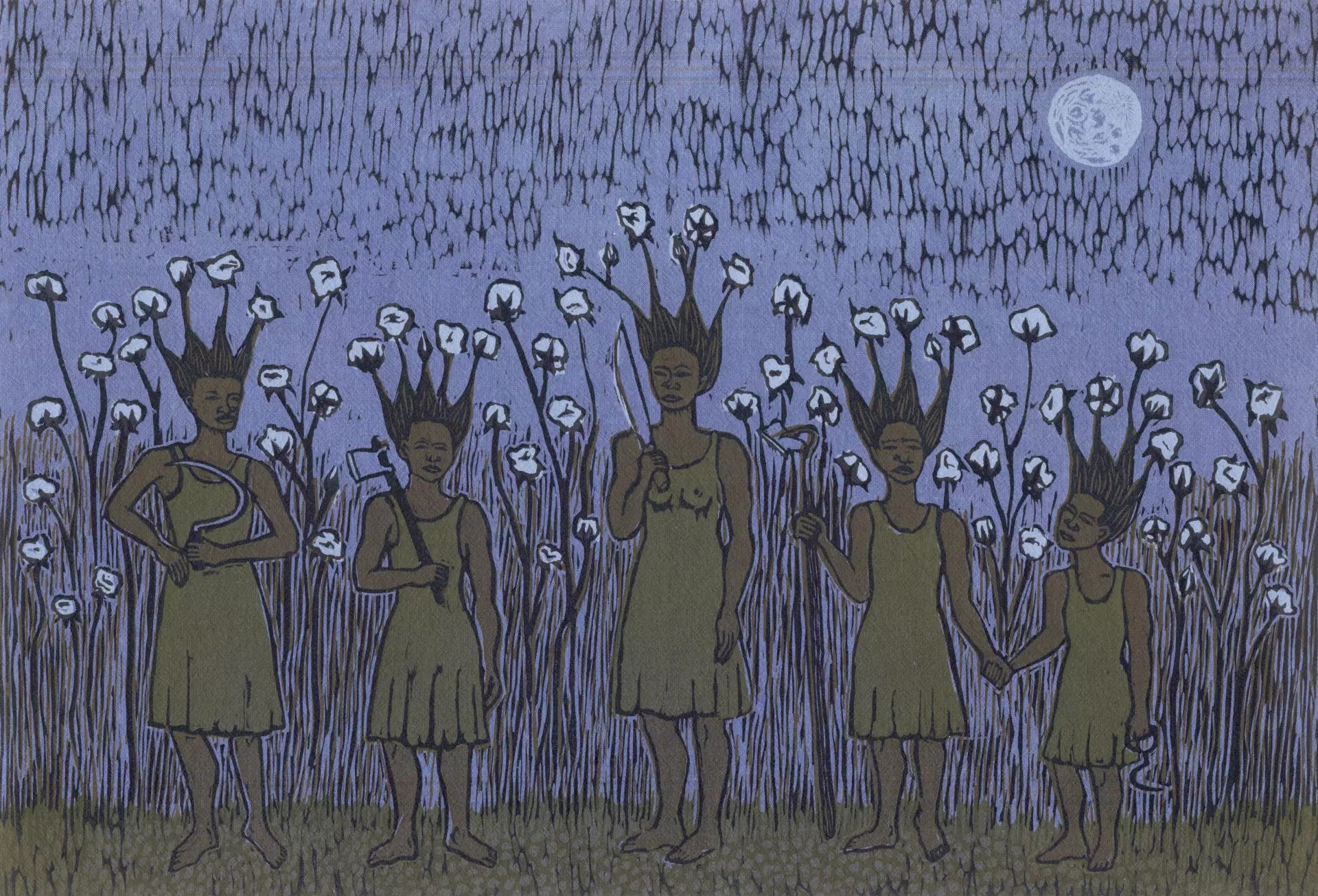 Their sacks are full, but the field stretches on, boundless, unyielding. The cotton clings to their aprons like memory. Fluffy, yes, but hiding the burrs beneath. Their beauty is undeniable, almost idealized, and yet it is a beauty marked by grief. The woman on the left bears an expression that holds too much: defiance, sorrow, distrust, each layered over the quiet disbelief of a freedom that has changed little. These women are no longer enslaved, but they are not yet free. They remain rooted in the same soil that once owned them, their stillness a metaphor for the false promises of progress.